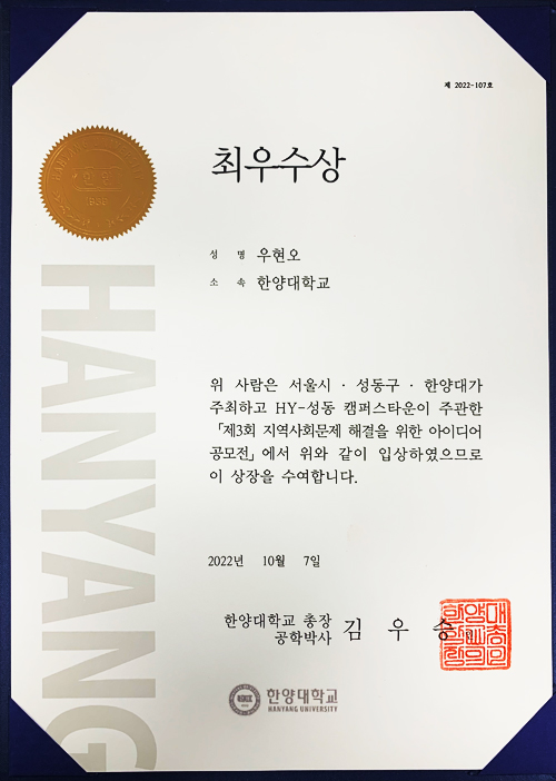 서울시 한양대학교 [지역사회문제해결 아이디어 공모전] 최우수상