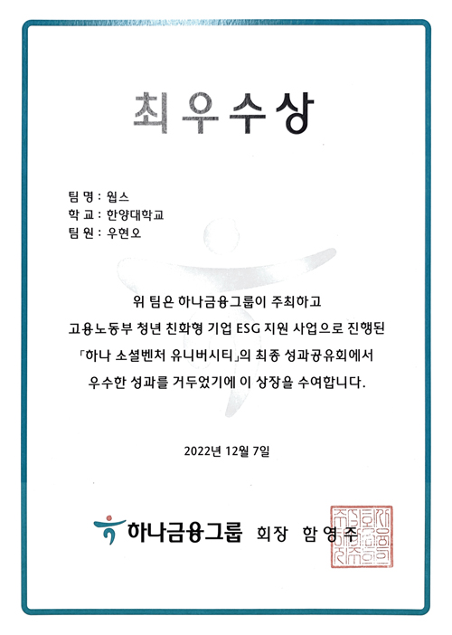 하나금융 소셜벤처 유니버시티 최우수상