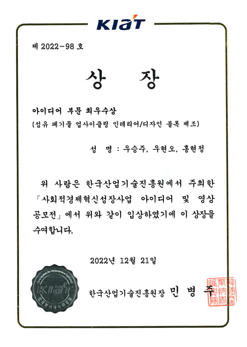 한국산업기술진흥원 아이디어 부문 최우수상