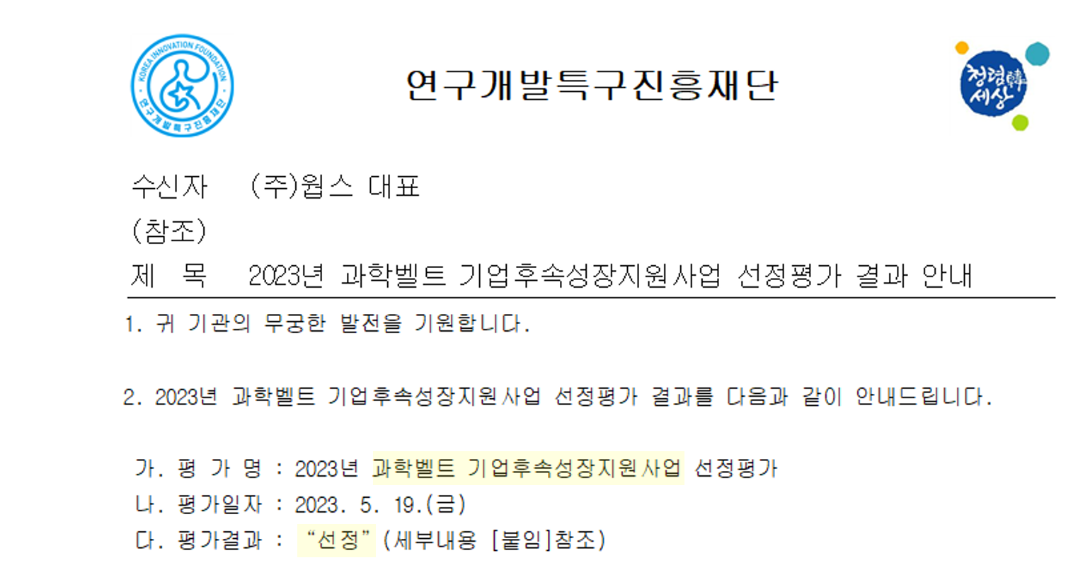 2023년 5월 19일 과학기술정보통신부와 연구개발특구진흥재단에서 주관하는 '과학벨트 기업후속성장 지원사업'에 최종 선정됐습니다.
