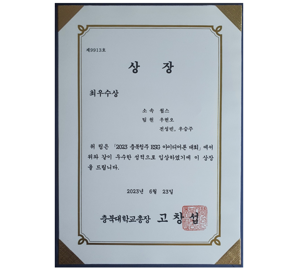 [수상] 2023 충북청주 ESG 아이디어톤 대회 최우수상