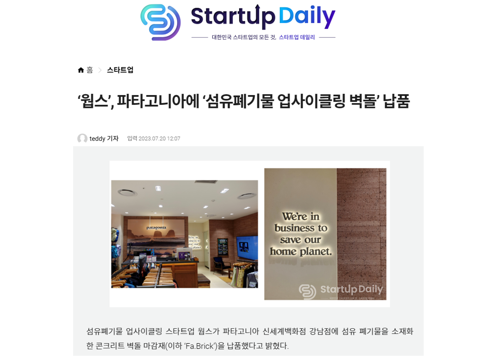 [보도자료] 스타트업데일리, '웝스, 파타고니아에 납품'