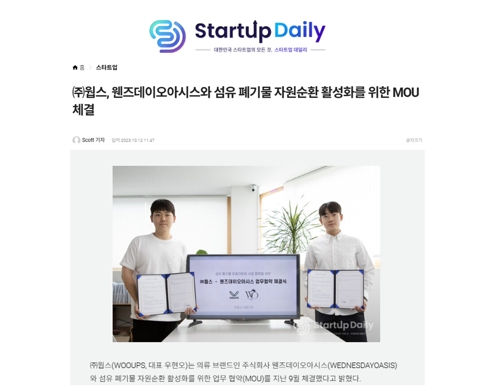 - (클릭) ㈜웝스, 웬즈데이오아시스와 섬유 폐기물 자원순환 활성화를 위한 MOU 체결 < 스타트업 < 기사본문 - 스타트업데일리 (startupdaily.kr)