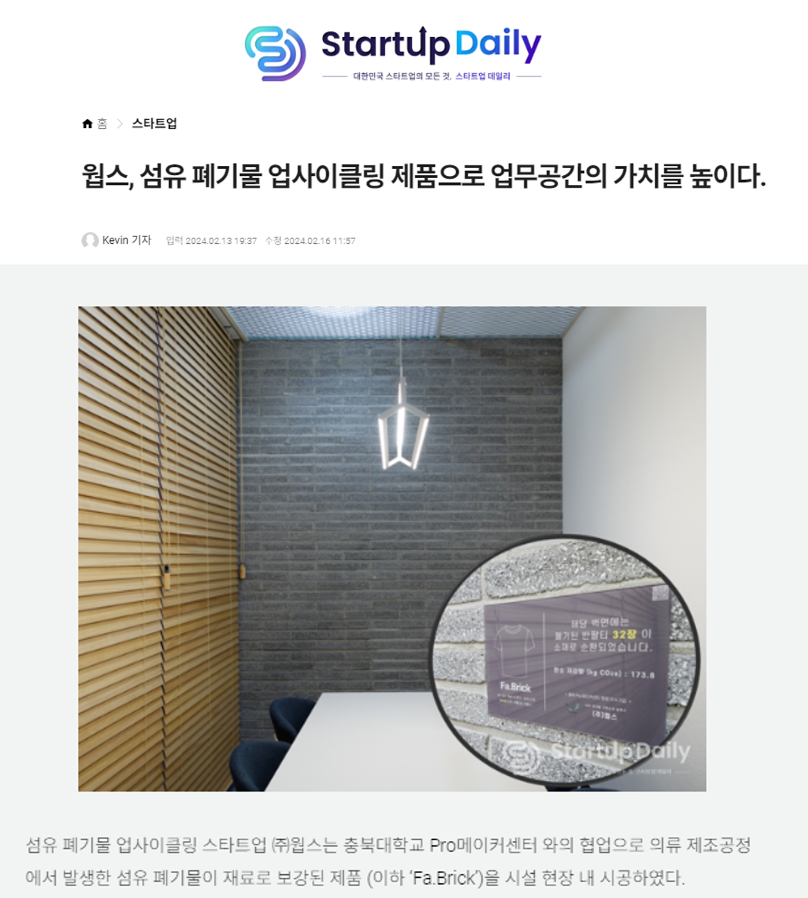 " (주)웝스, 섬유 폐기물 업사이클링 제품으로 업무공간의 가치를 높이다. "