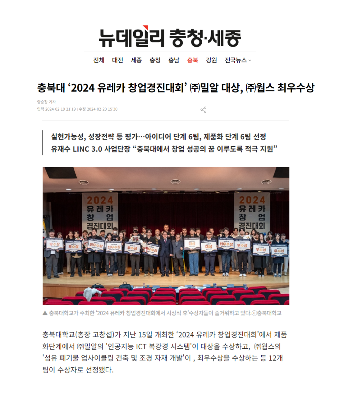 - (클릭) 충북대 ‘2024 유레카 창업경진대회’ ㈜밀알 대상, ㈜웝스 최우수상 | Save Internet 뉴데일리 (newdaily.co.kr)
