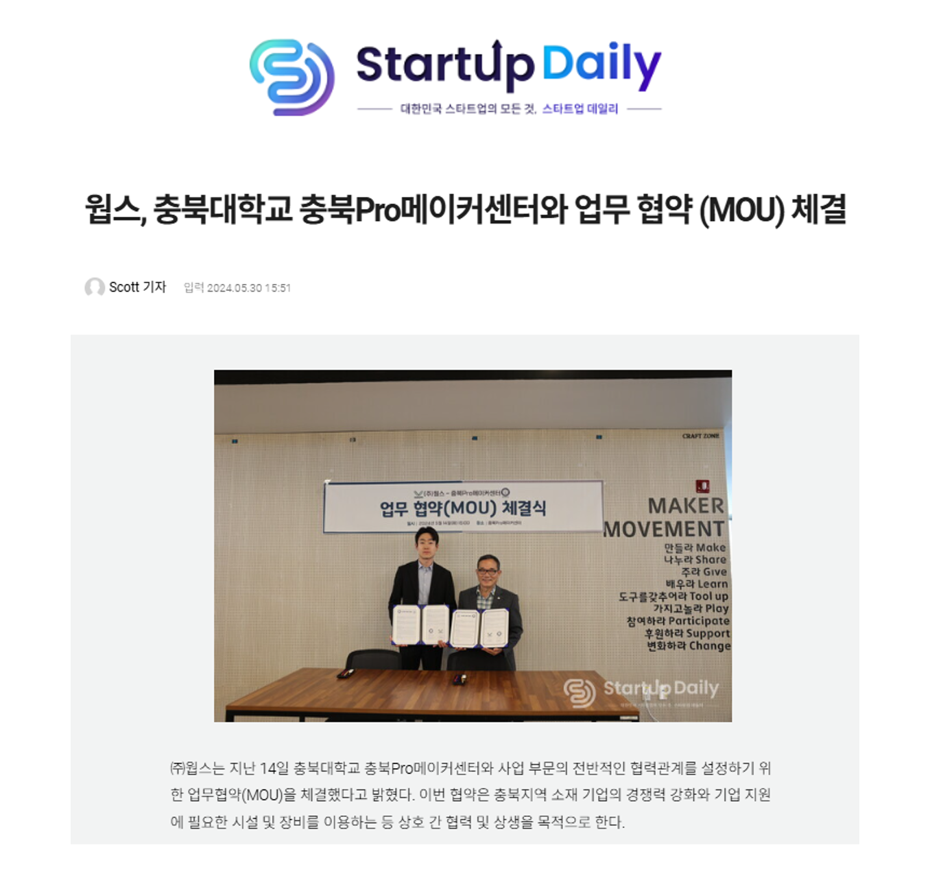 - (클릭) 웝스, 충북대학교 충북Pro메이커센터와 업무 협약 (MOU) 체결 < 스타트업 < 기사본문 - 스타트업데일리 (startupdaily.kr)