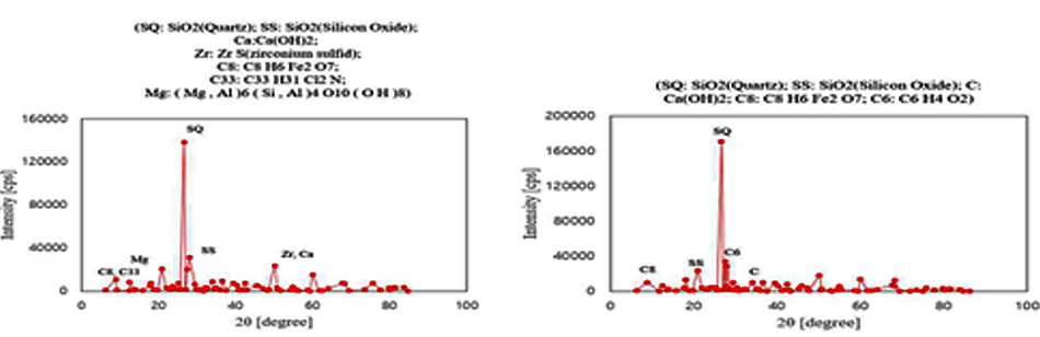 섬유 분쇄물 혼입시의 콘크리트 블록에 미치는 영향과 환경오염 영향 여부 파악을 위한 XRD 분석을 통해 섬유 분쇄물이 혼입된 콘크리트 단면을 분석/평가한 결과,